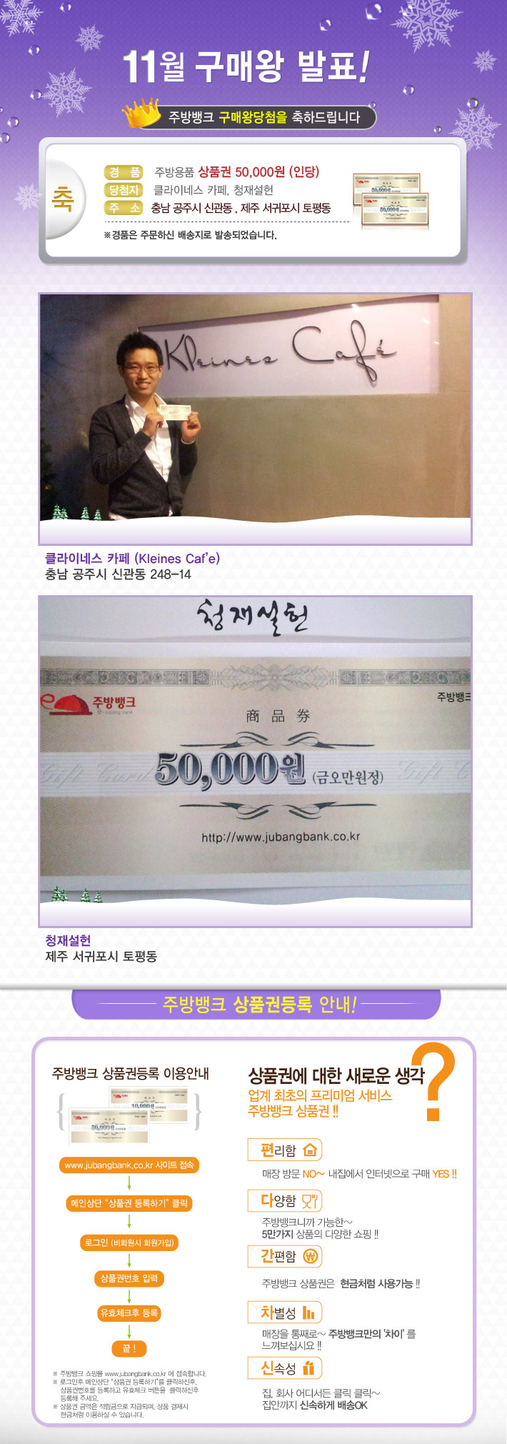 업소용주방용품쇼핑몰 주방뱅크는 매월 최다 '구매왕'을 선정합니다. 매월 구매금액에 따른 구매왕을 선정하여 '상품권'을 보내드리고 있습니다. 구매왕에 선정되신 고객님은 업소를 홍보할 수 있는 기회도 드리오니, 상품권 인증샷에 추가하여 매장사진 및 기타 자료를 보내주세요. 고객님의 많은 참여 바랍니다 ^ ^ 주방뱅크 고객이라면 누구든지 도전할 수 있습니다.