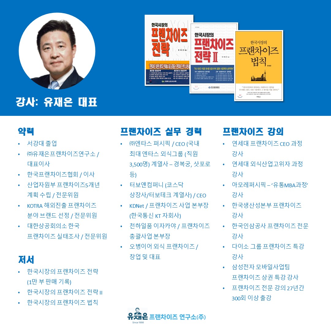◎ 교육비용 : 정상가 70만원 (정규교재 및 강사 저서 포함) 계좌 : 우리은행 1005-104-742674 (주)유재은프랜차이즈연구소