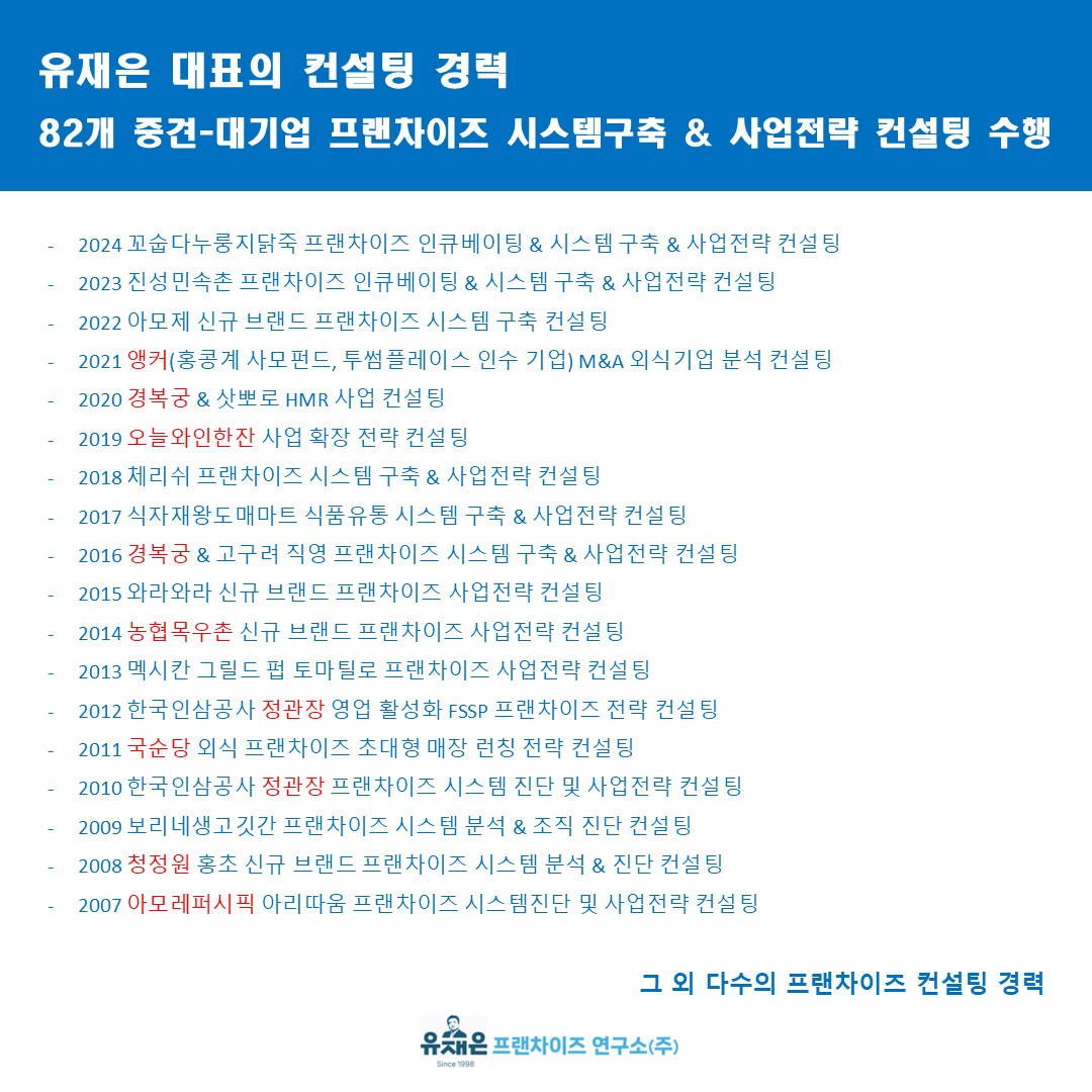 유재은프랜차이즈연구소에서 진행하는 프랜차이즈 본사 시스템 구축(본사 인큐베이팅) 속성 5기를 모집합니다.