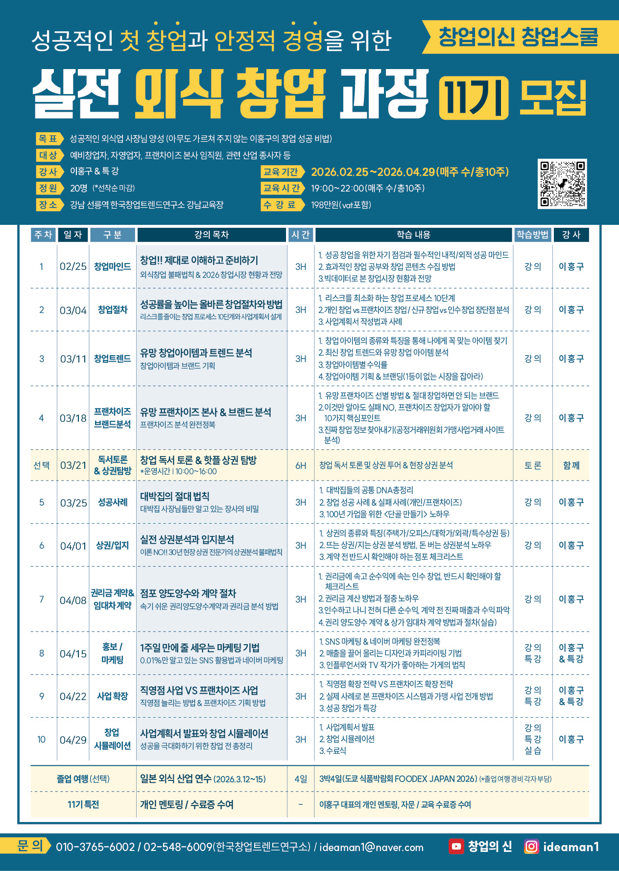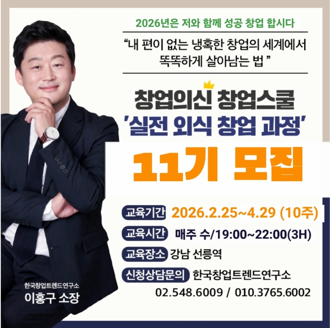 <실전 외식 창업 과정의 특징> 1. 30년간 1,000여 건의 창업 컨설팅 수행 중인 이홍구 대표의 실전 창업 강의 2. 창업자가 여러 창업 준비 과정에서 속지 않고 안전하게 창업할 수 있는 방법 습득 3. 유행 아이템을 골라내고 중장기적 운영이 가능한 성공창업의 구조 교육 4. 좋은/나쁜 프랜차이즈 본사와 브랜드 분석 가능 5. 2026년 창업시장 분석 데이터를 기반으로 한 실전 교육 커리큘럼 6. 개인창업/프랜차이즈창업/인수창업(양도양수)의 자세한 비교 분석과 전략 7. 창업 전 사업계획서 완성 8. 창업아이템/프랜차이즈/마케팅/상권분석/권리금/임대차 계약/사업계획서까지 실습 중심 9. 이홍구 대표의 1:1 상담 및 컨설팅 10. 동기, 동문들과의 네트워크로 성공 창업의 노하우 습득