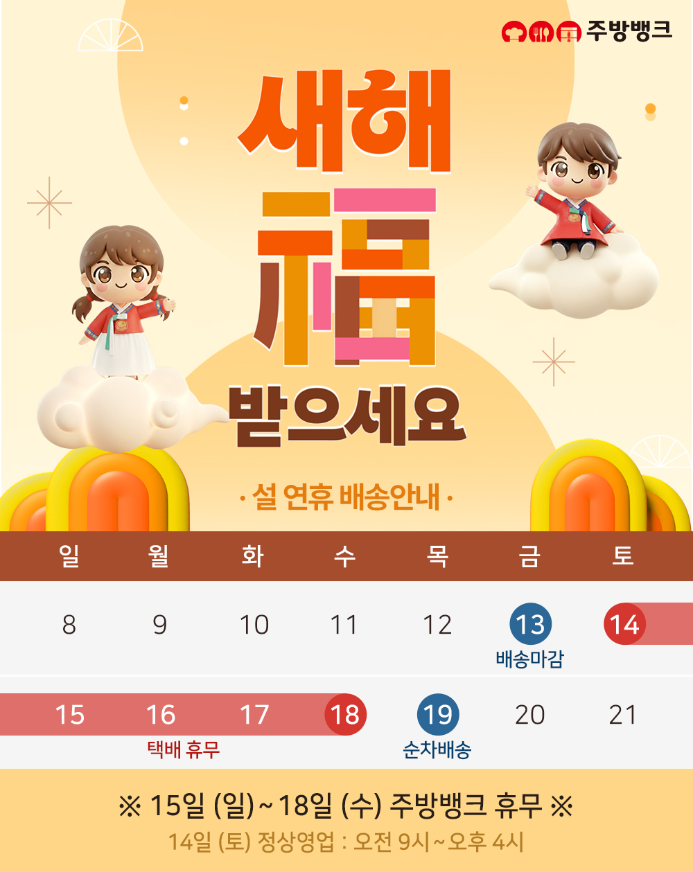 다가오는 설 명절 연휴로 인한 배송 일정 및 주방뱅크 운영 시간을 아래와 같이 안내드리오니, 이용에 불편함이 없으시길 바랍니다.