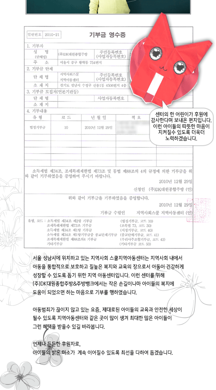 (주)DK대원종합주방&주방뱅크가 지역사회스쿨지역아동센터의 후원자가 되었습니다