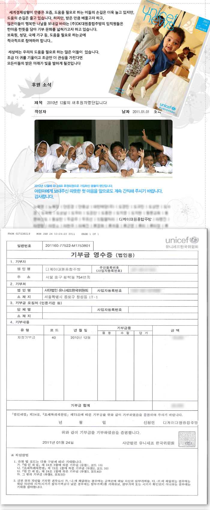 유니세프의 후원자가 된(주)DK대원종합주방