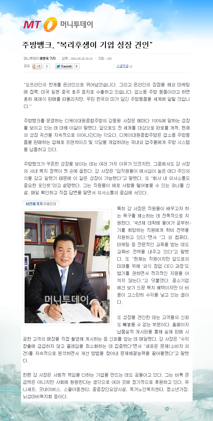 [머니투데이 인터넷 기사] 주방뱅크 "복리후생이 기업 성장 견인" 강동원 대표 소개