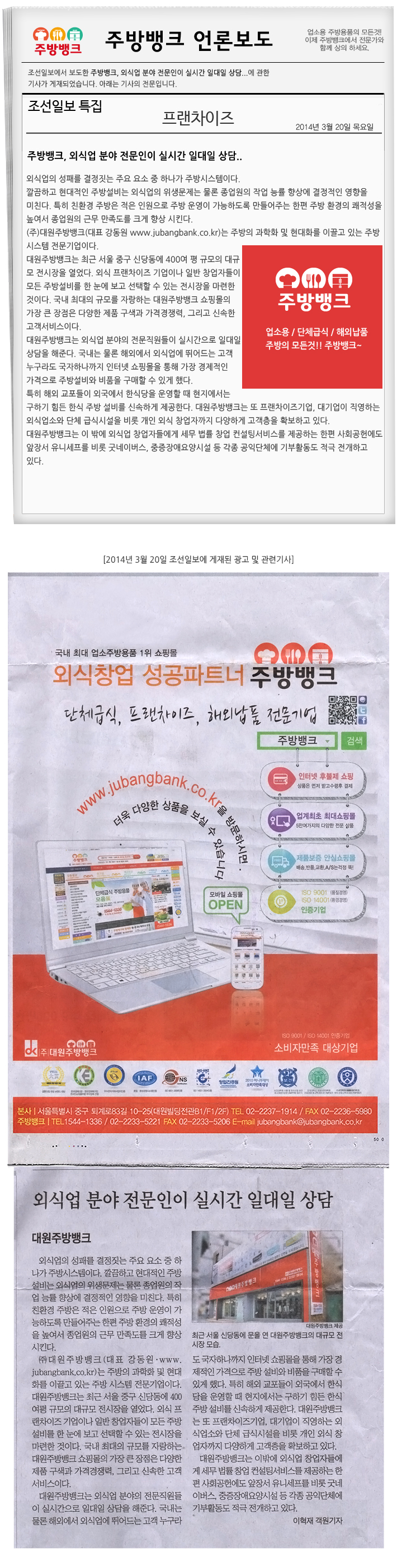 [조선일보]대원주방뱅크,외식업 분야 전문인이 실시간 일대일 상담에 관한 기사
