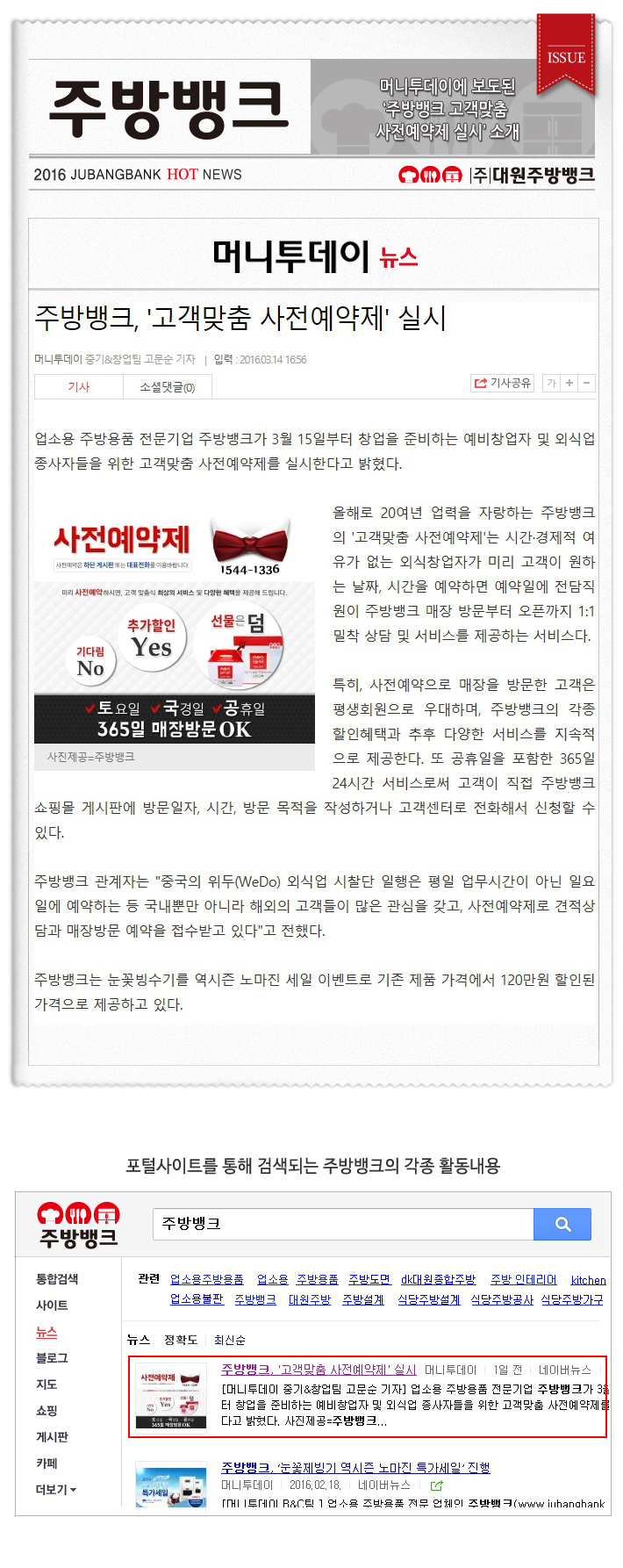 머니투데이 '주방뱅크 고객맞춤 사전예약제 실시' 관련 기사