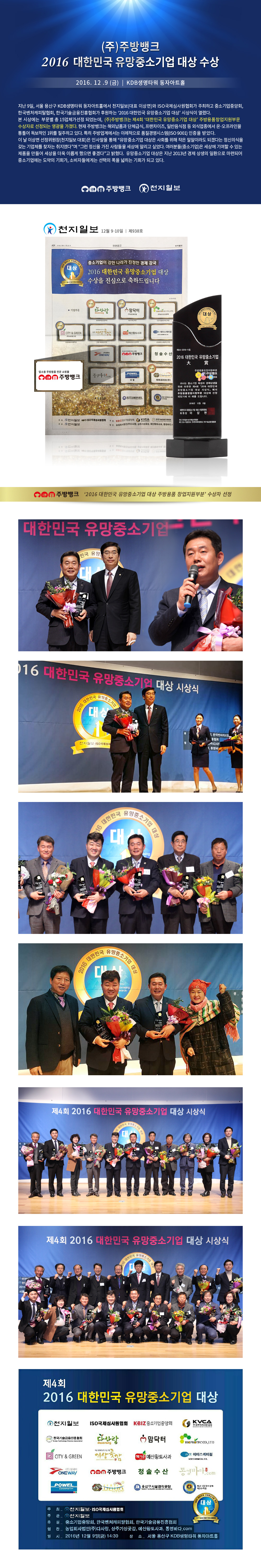 2016 대한민국 유망중소기업 대상으로 선정된 (주)주방뱅크