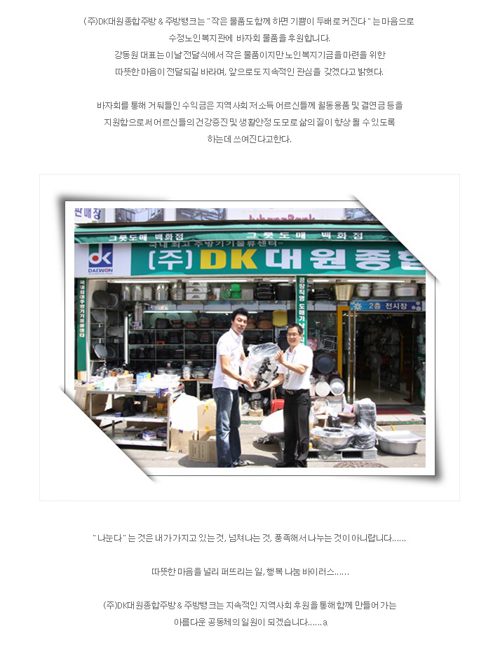 주방뱅크는 나눔을 실천하는 기업정신으로 수정노인복지관 바자회 물품을 후원합니다.