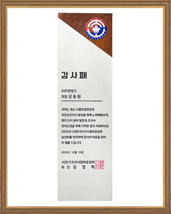 한국조리사협회중앙회 김정학 회장, 감사패 수여