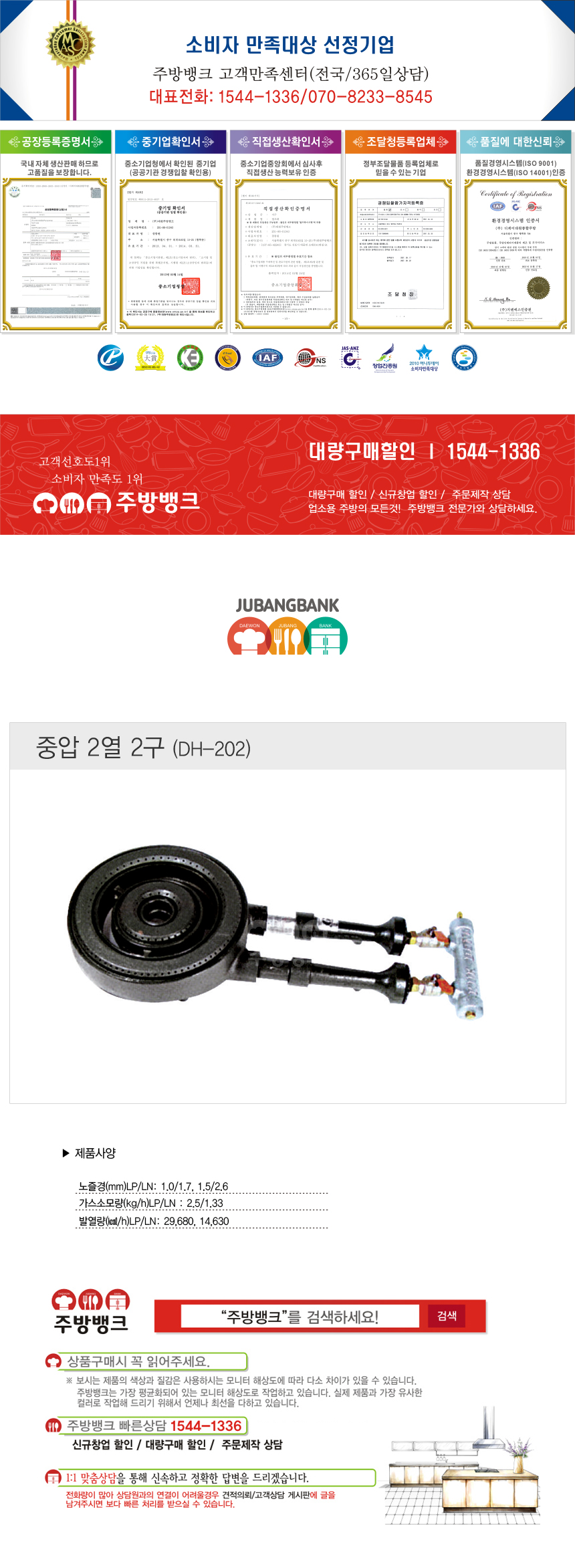 | 제품사양 | 노즐경(mm)LP/LN : 1.0/1.7 , 1.5/2.6 가스소모량(kg/h)LP/LN : 2.5/1.33 발열량(㎉/h)LP/LN : 29.680 , 14.630 |