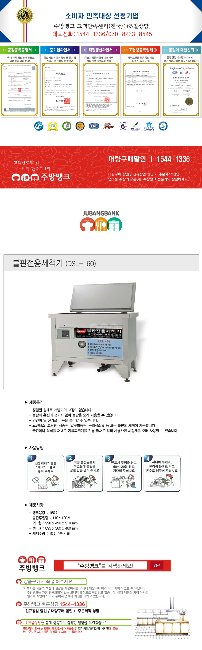 | 제품사양 | -탱크용량 : 160 L -불판투입량 : 110 ~ 120개 -외 형 : 990 x 490 x 510 mm -탱 크 : 895 x 360 x 460 mm -세제수량 : 10L 4통 / 월 맞춤제작 주문전 문의바랍니다. |