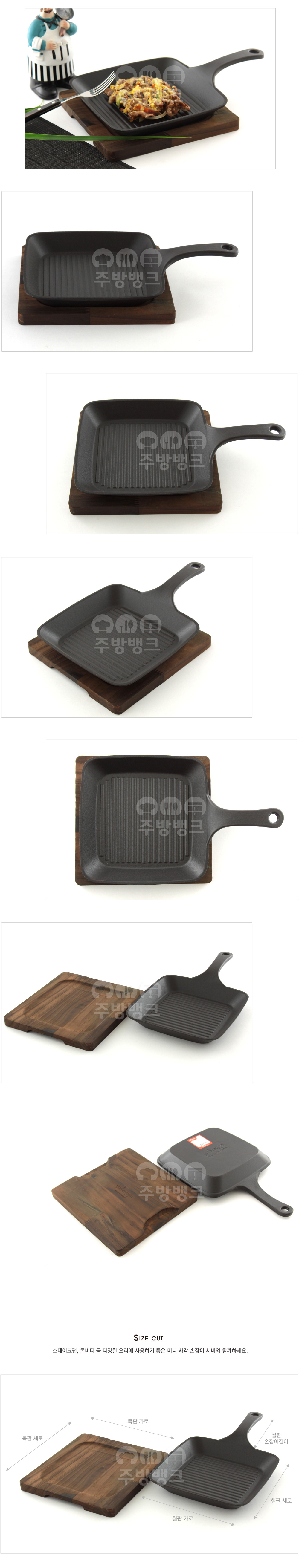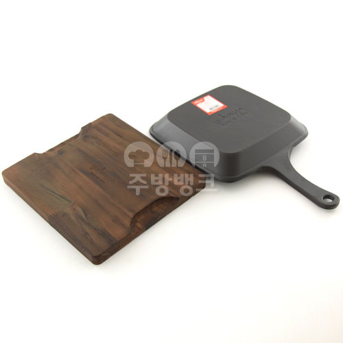 | 사이즈 | 가로x세로x높이(cm) 철판 : 21×21×3cm / 손잡이 : 13cm 목판 : 23×22cm |