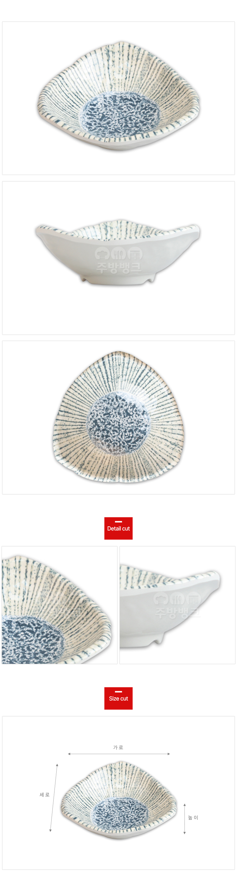 앞접시부터 반찬그릇까지 다용도로 사용 가능한 삼각사라입니다.
