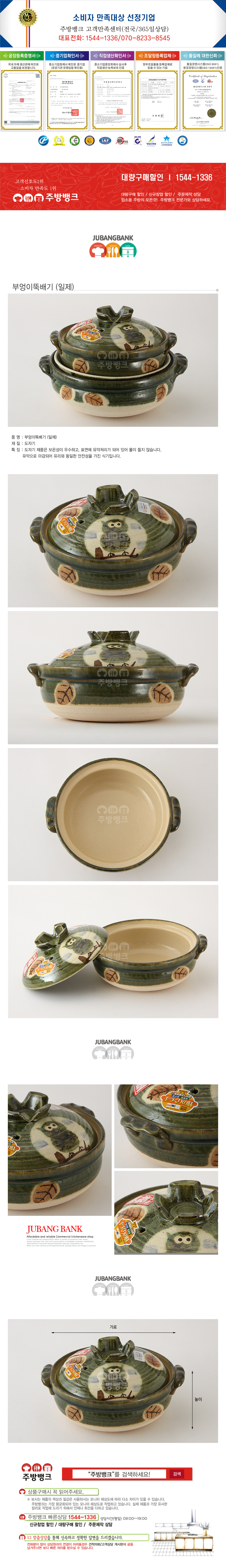 | 제품사양 | 1.재질 : 도자기 2.사이즈 : (지름 x 높이) cm 부엉이뚝배기 中(일제-74A) : 22.5 x 13 cm 부엉이뚝배기 大(일제-75A) : 25.2 x 14 cm ※ 사이즈는 측정 방식에 따라 약간의 오차가 있을 수 있습니다. ※ 모니터에 따라 약간의 색상 차이가 있을 수 있습니다. ※ 상기 이미지는 실제와 다를 수 있으며, 제품은 사정에 따라 외관, 사양 등 제품의 성능 및 개선을 위하여 사전예고 없이 변경될 수 있습니다. |