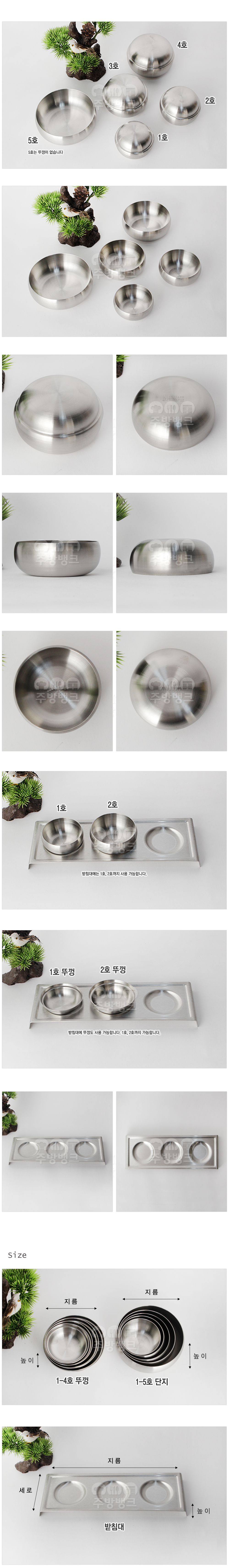 | 사이즈 | 지름×높이(cm) 복단지(스텐) 1호 뚜껑 : 6.6x2cm 복단지(스텐) 1호 단지 : 6x2.7cm 복단지(스텐) 2호 뚜껑 : 7.3x2.1cm 복단지(스텐) 2호 단지 : 6.7x3cm 복단지(스텐) 3호 뚜껑 : 8.3x2.3cm 복단지(스텐) 3호 단지 : 7.7x3.1cm 복단지(스텐) 4호 뚜껑 : 9.4x2.4cm 복단지(스텐) 4호 단지 : 8.7x3.3cm 복단지(스텐) 5호 단지 : 10.2x3.6cm 가로×세로×높이(cm) 받침대(스텐) : 25.6x8.9x1.8cm |