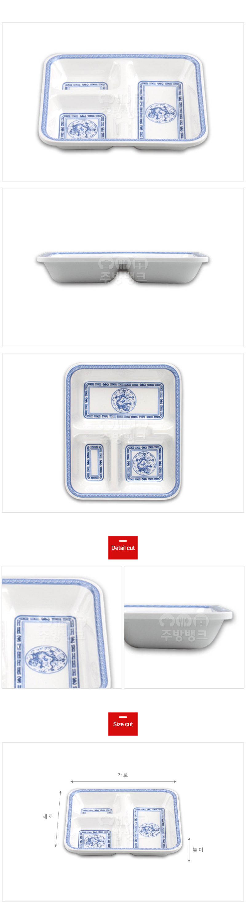 | 사이즈 | 가로×세로×높이(cm) (DS-7662) 청룡 중식3찬기 : 11.8x13.7x2.2cm |
