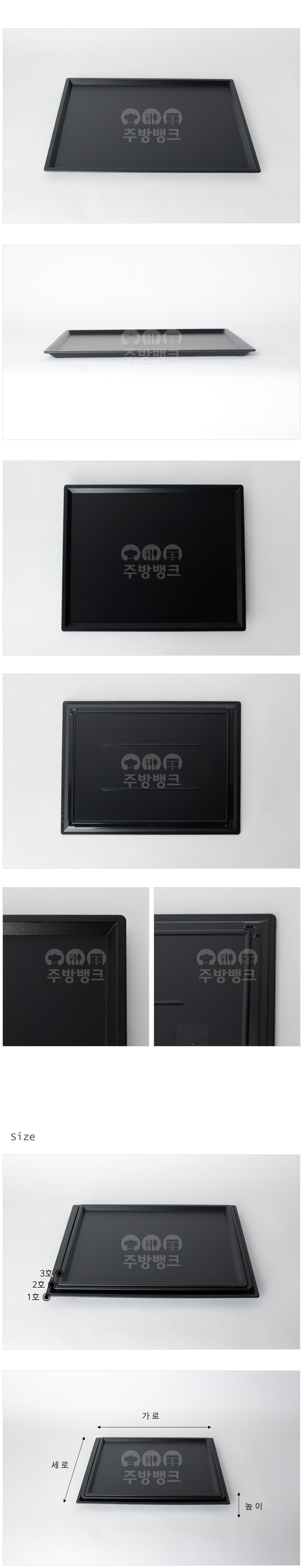| 사이즈 | 가로×세로×높이(cm) 블랙쟁반-블랙 3호 : 40x30x1.8cm 블랙쟁반-블랙 2호 : 42x32x1.7cm 블랙쟁반-블랙 1호 : 44x34x1.8cm |